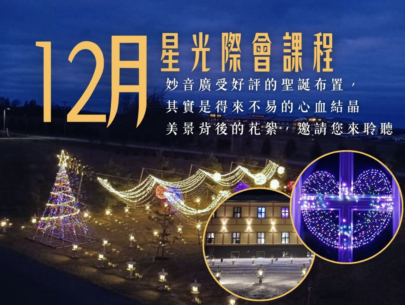 妙音南蓮覺苑較為西式的建築風格,與寬廣的庭院,懸掛起各式串燈,總是讓人留下深刻印象、廣受好評。但每年的架設與維護,可不是一件輕鬆的事。本月星光際會,邀請您來聆聽,聖誕佈置的幕後花絮。